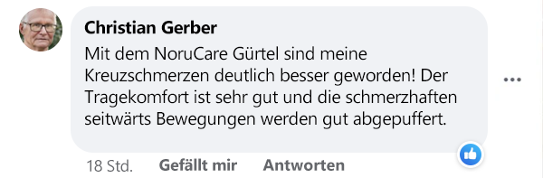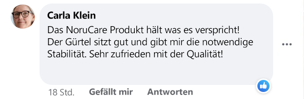 "Vorher konnte ich kaum noch längere Wege gehen. Meine Kreuzschmerzen waren zu stark und ich hatte ständig Angst vor plötzlichen Bewegungen. Mit dem NoruCare Lumbaris Pro habe ich wieder Mut gefasst. Ich fühle mich stabiler und sicherer bei jedem Schritt. Besonders beim Einkaufen und bei der Hausarbeit ist er eine große Hilfe – ich muss nicht mehr ständig daran denken, wie ich mich bewege. Ich genieße es, wieder mehr machen zu können ohne diese ständige Angst. Für mich ist das ein echter Gewinn an Lebensqualität. Der Gürtel sitzt perfekt, ist angenehm zu tragen und ich würde ihn jederzeit wieder kaufen!"